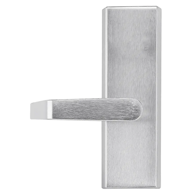 Constructed with a Grade 1 heavy-duty cast escutcheon and solid lever, this trim is non-handed for universal installation on either left- or right-swing doors. It supports standard 1-3/4" door thickness and through-bolt mounting for extra strength. Finished in satin chrome US26D, it provides a clean, architectural appearance suited for commercial and institutional applications.