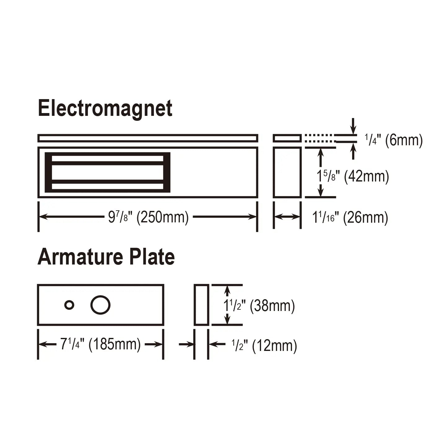 Armature plate dimensions: 7-1/4″ x 1-1/2″ x 1/2″ (185 × 38 × 12 mm)