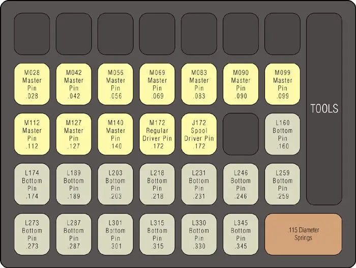 26 distinct pin sizes to cover a broad range of key depths and master-keying conditions.