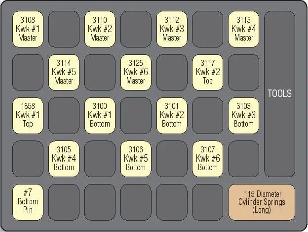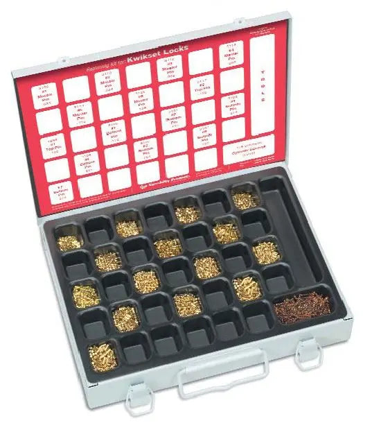 This Kwikset pin kit by Specialty Products is engineered specifically for Kwikset cylinders and key systems. It includes high-quality .115″ diameter pins and matching springs, in 15 different sizes, with 100 pins of each size. The pins are organized in a single level layout inside a rugged, metal carrying case with a leak-proof cover and sturdy handle—perfect for mobile or shop use. For locksmiths servicing Kwikset hardware, this kit offers direct compatibility, minimizes guesswork, and eliminates the need to source separate pins for each size or brand.
