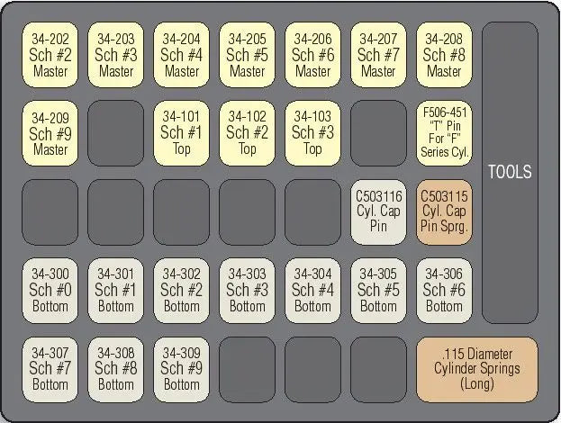 The SCH-115 Pin Kit from Specialty Products is specifically designed to match the factory pin specifications for Schlage® brand cylinders. It includes .115″ diameter top and bottom pins, springs, cap pins and “T” pins (for F-series locks) in 22 different sizes — each size supplied with 100 pieces. The kit is packaged in a heavy-duty metal case with a leak-proof cover and an unbreakable plastic insert for organization and transport.